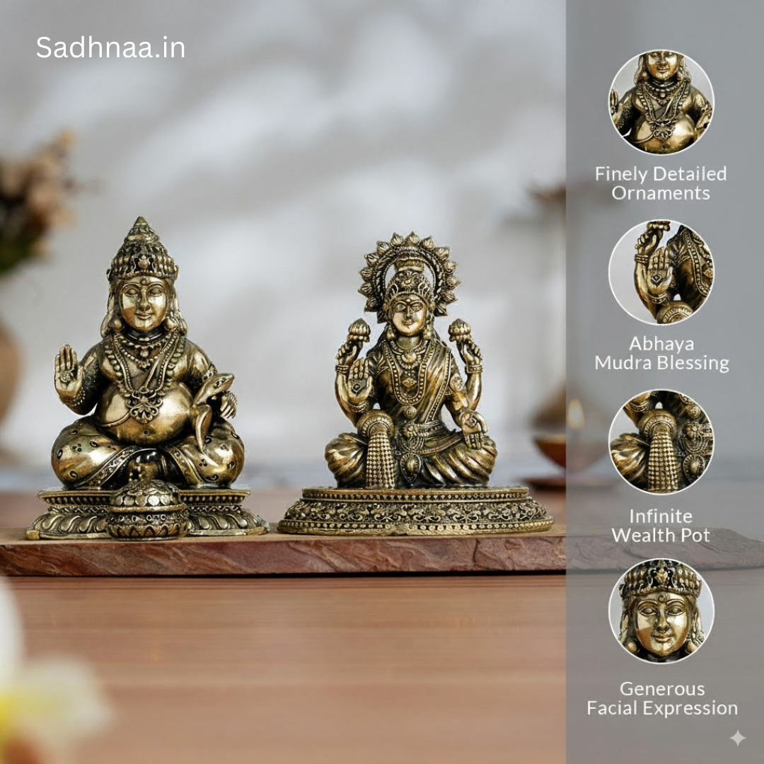 Beside her, the 4-inch kubera statue for wealth depicts the Hindu god of riches in royal attire, a raised hand promising varada mudra boons. Intricate details showcase his silken dhoti, jeweled ornaments, and an elaborate crown, with a pot of abundant coins and jewels before him.
