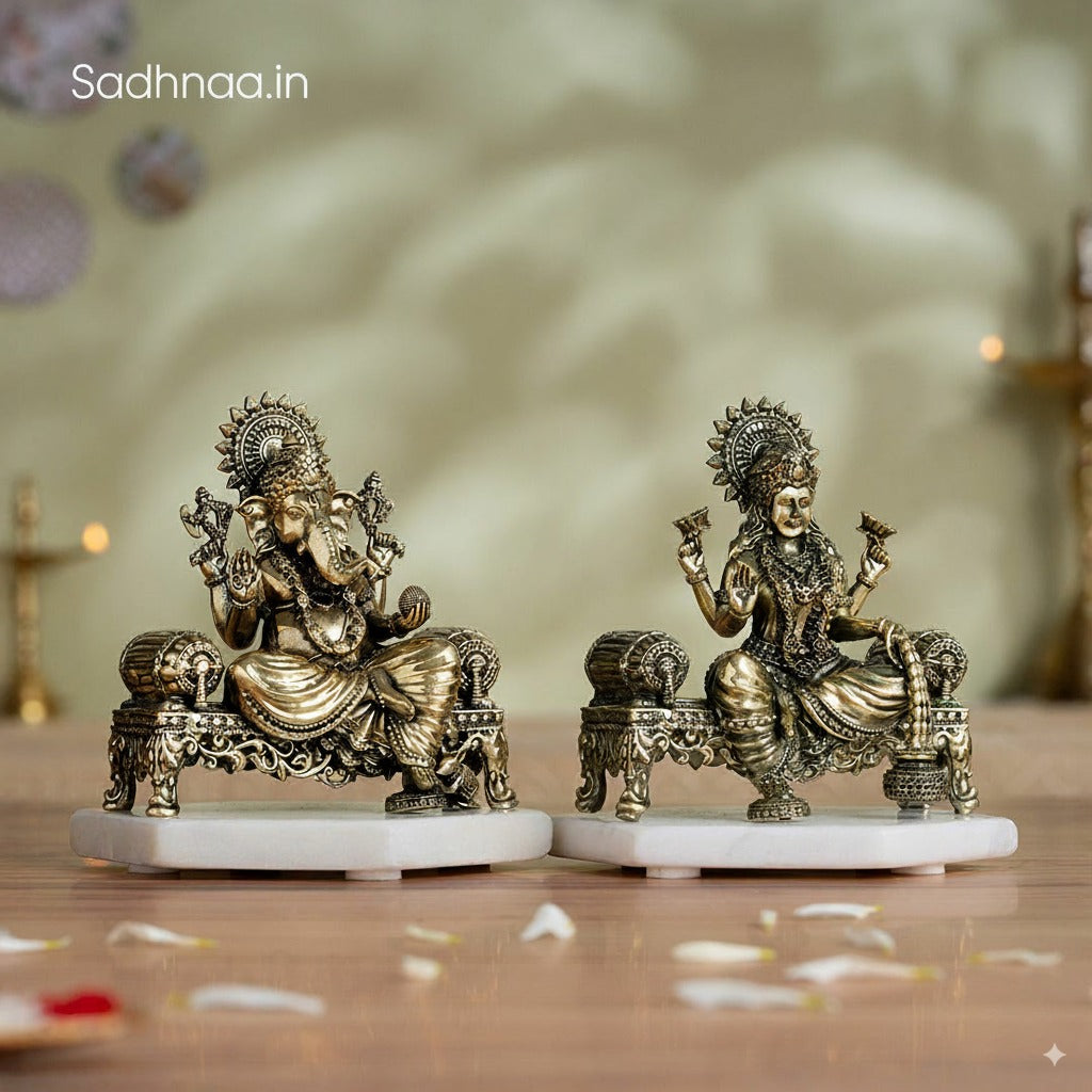 The Lord Ganesha murti, known as the Remover of Obstacles, stands alongside a radiant Lakshmi statue, invoking prosperity and abundance.