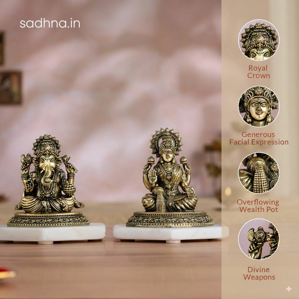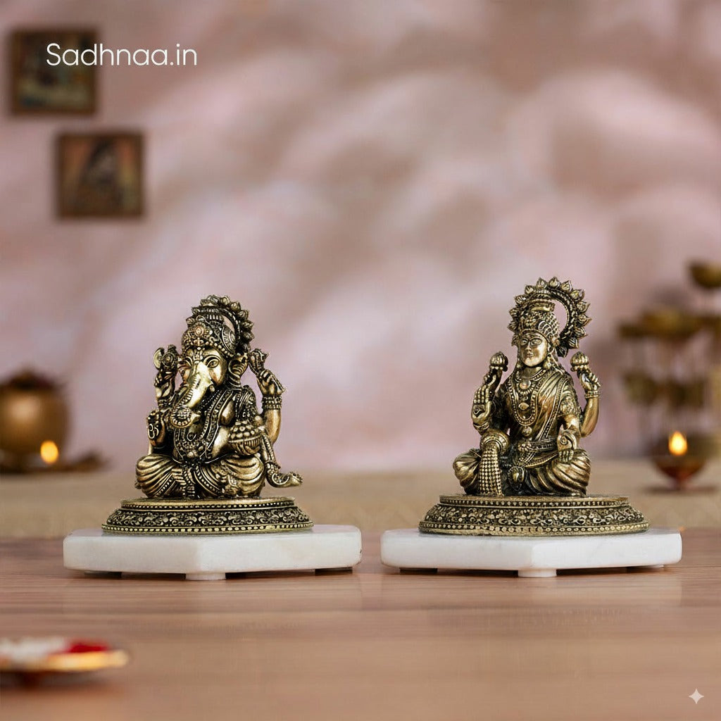 This Brass Laxmi Ganesh murti set, crafted in shining brass, features 4-inch idols of Goddess Lakshmi and Lord Ganesha.