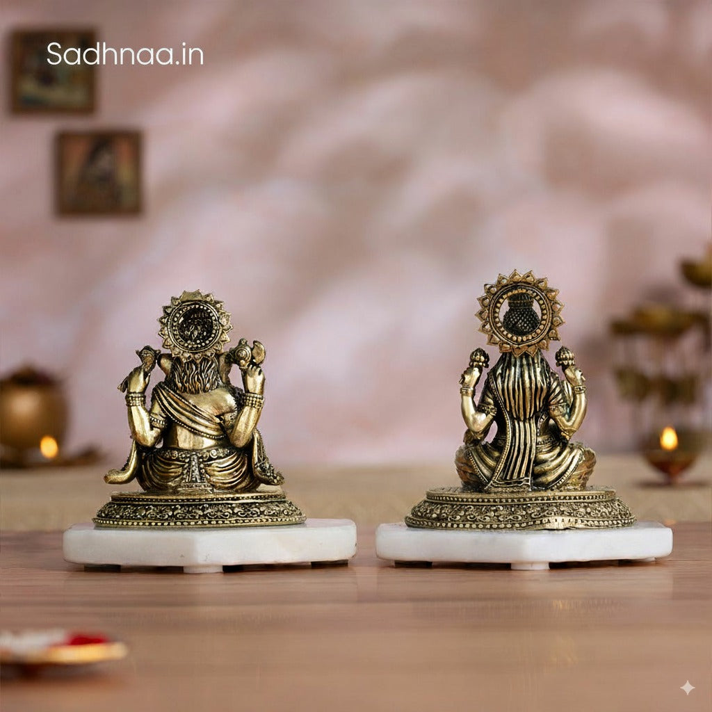 Enhance the festivities of Navratri or Dhanteras by gifting this brass Vinayaka idol and Lakshmi murti set, as it symbolizes wealth, prosperity, and blessings, making it a revered choice for these auspicious occasions.