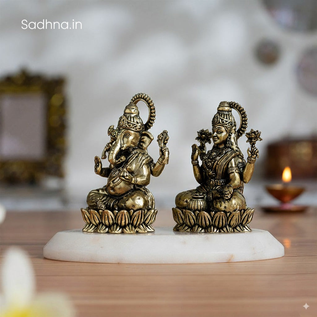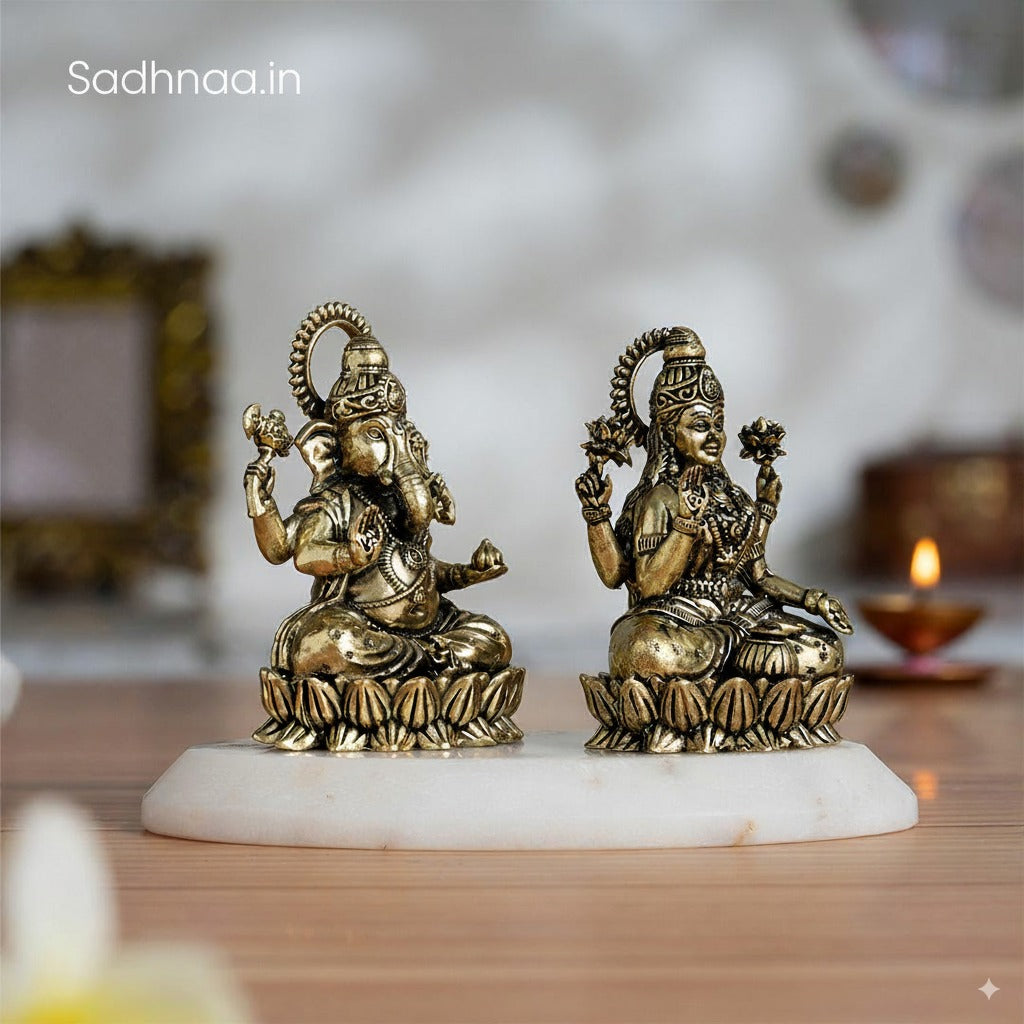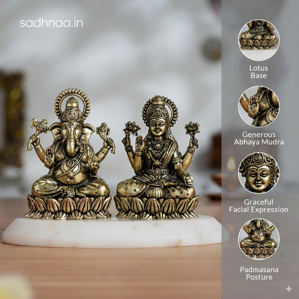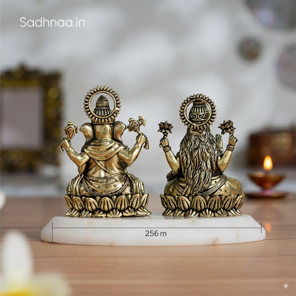Introducing this 3-inch Brass Lakshmi Ganesh Murti On Lotus, a perfect Laxmi Ganesh murti for your home decor. This Lakshmi and Ganesha murti set beautifully captures the essence of abundance and clarity in life. The brass Lakshmi Ganesh idol features Goddess Lakshmi seated on a lotus, symbolizing wealth, while Lord Ganesha represents wisdom and goodwill.